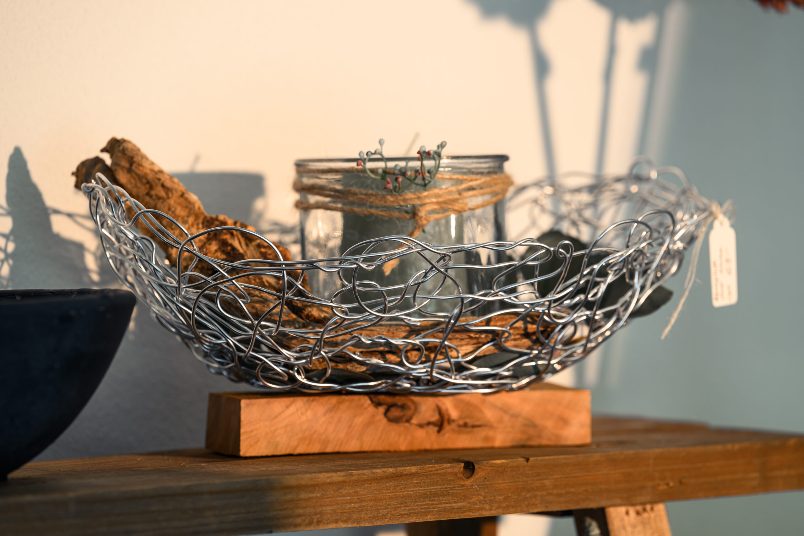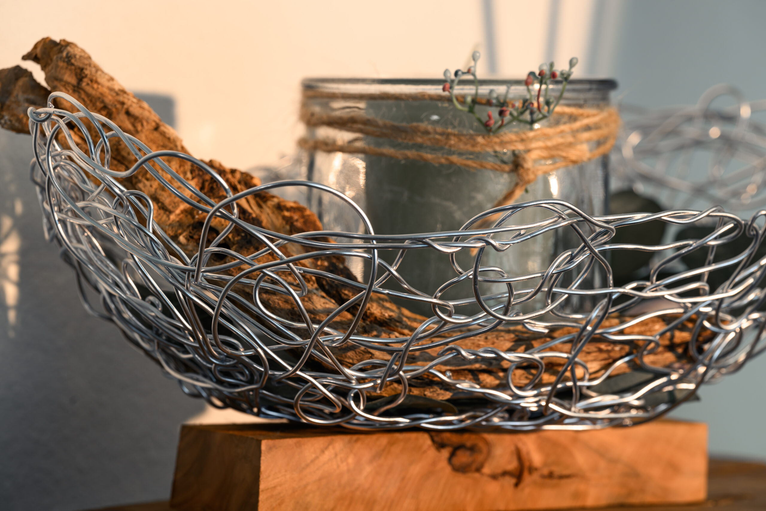 Dieses tolle Drahtkunstwerk auf einem Holzsockel ist ein garantiertes Unikat und mit viel Liebe zum Detail entstanden. Die Kerze und das Glas sind inclusive. L ca. 40cm/ B ca. 20cm
