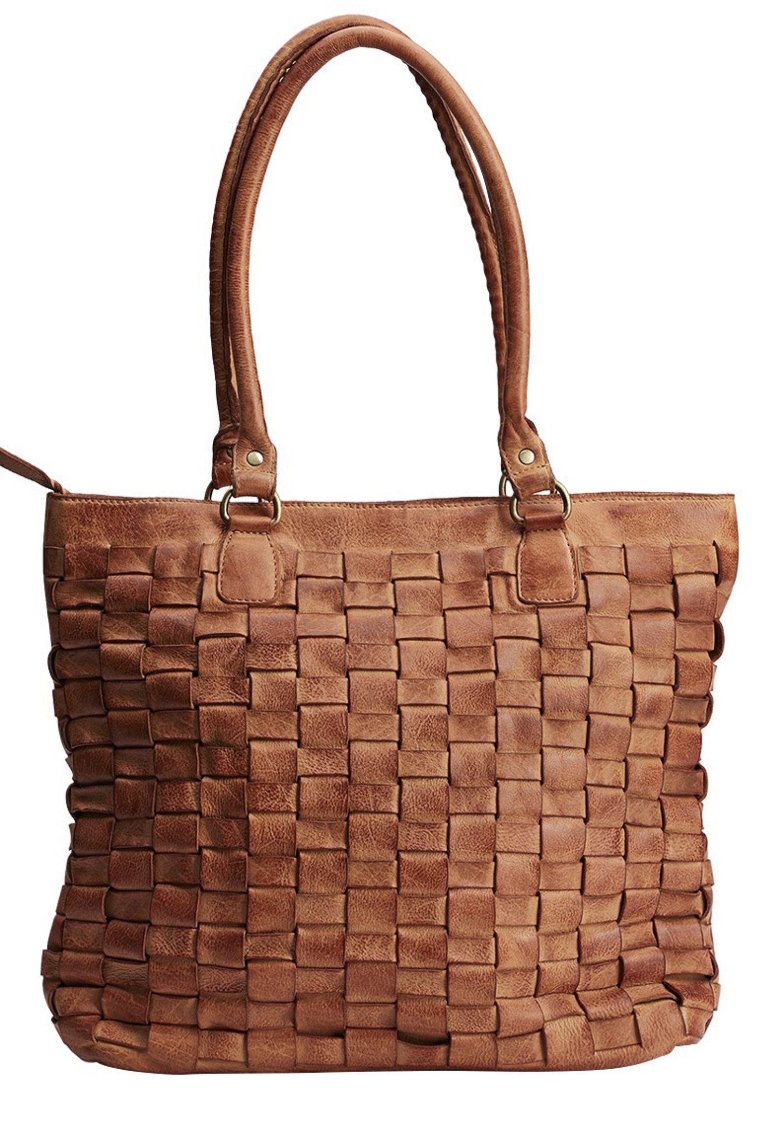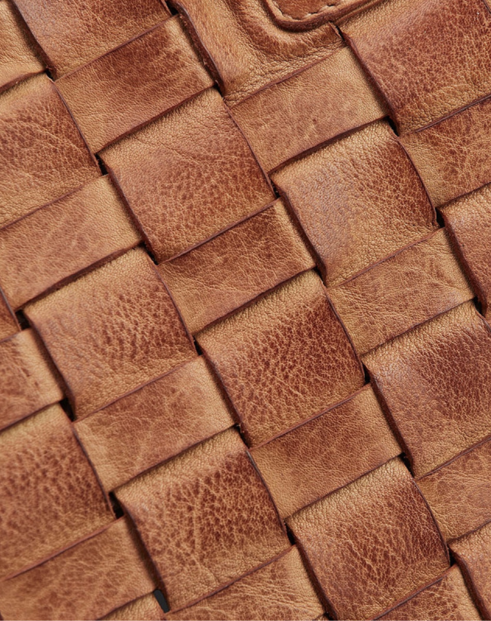 Tolle Ledertasche mit angesagtem Flechtwerk, in der Farbe dark tan antique, Masse: 33×45 cm/ T 9cm, abnehmbarer Lederriemen und Reissverschlussfach, voraussichtlich ab August 2025 lieferbar!