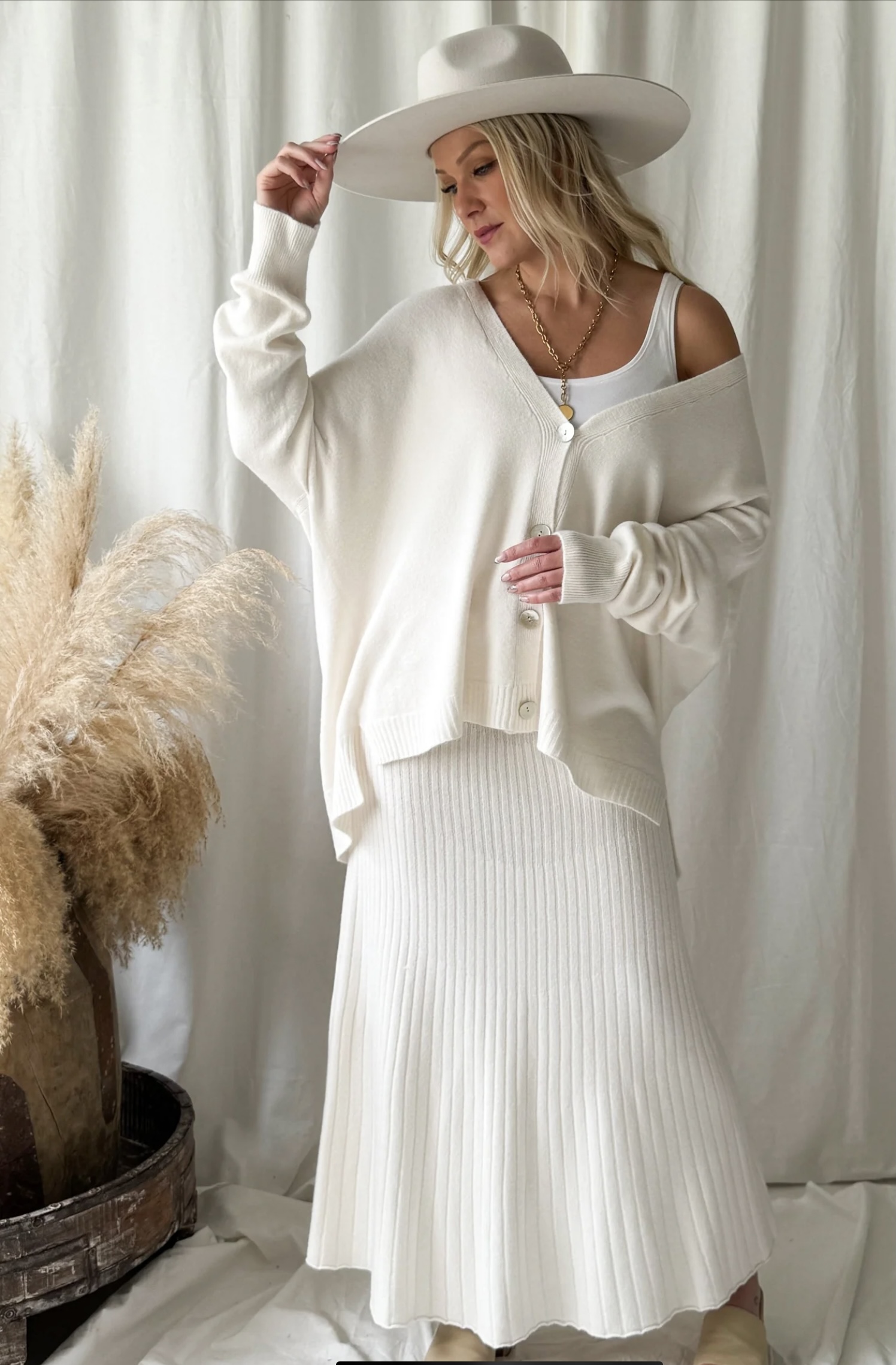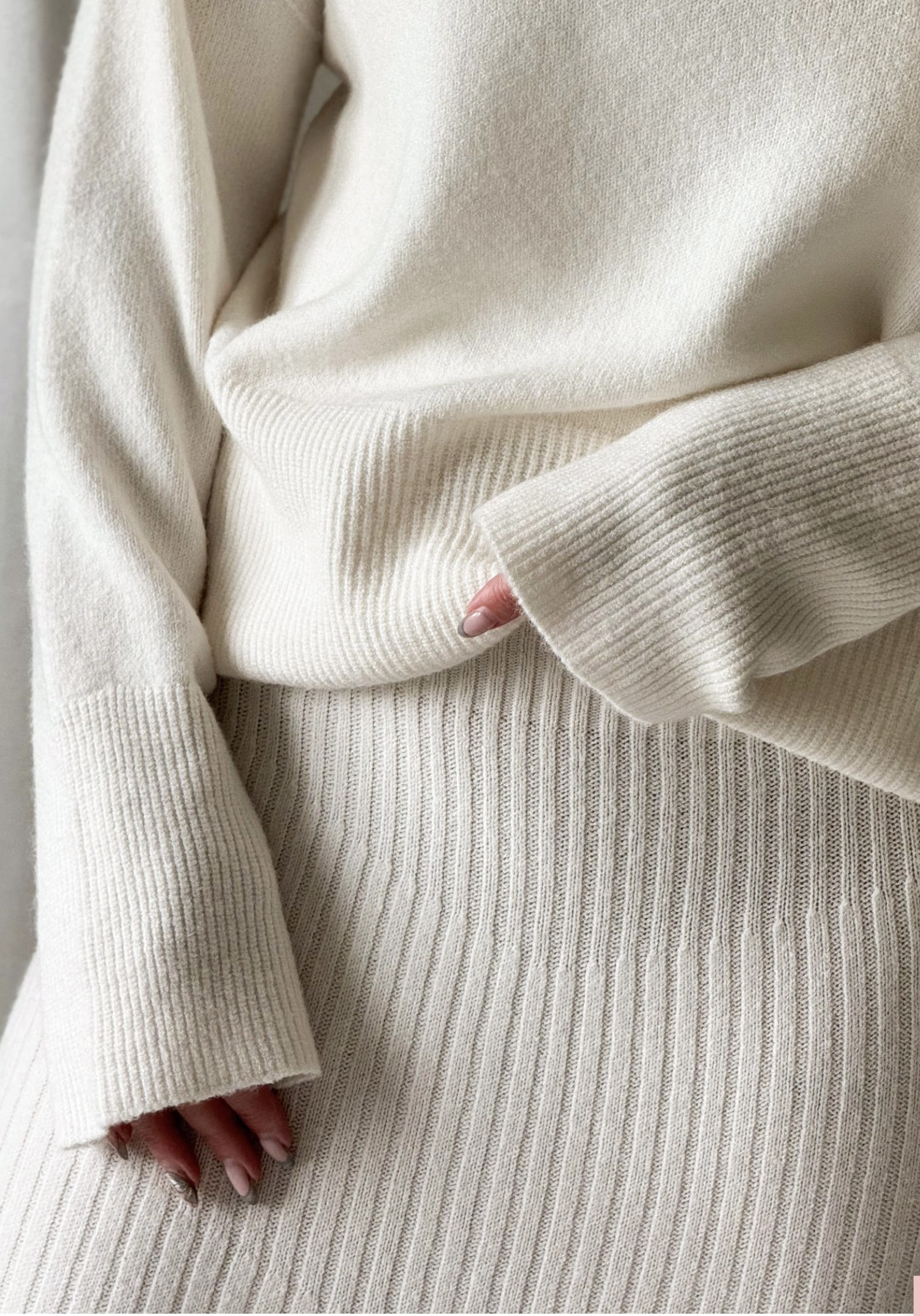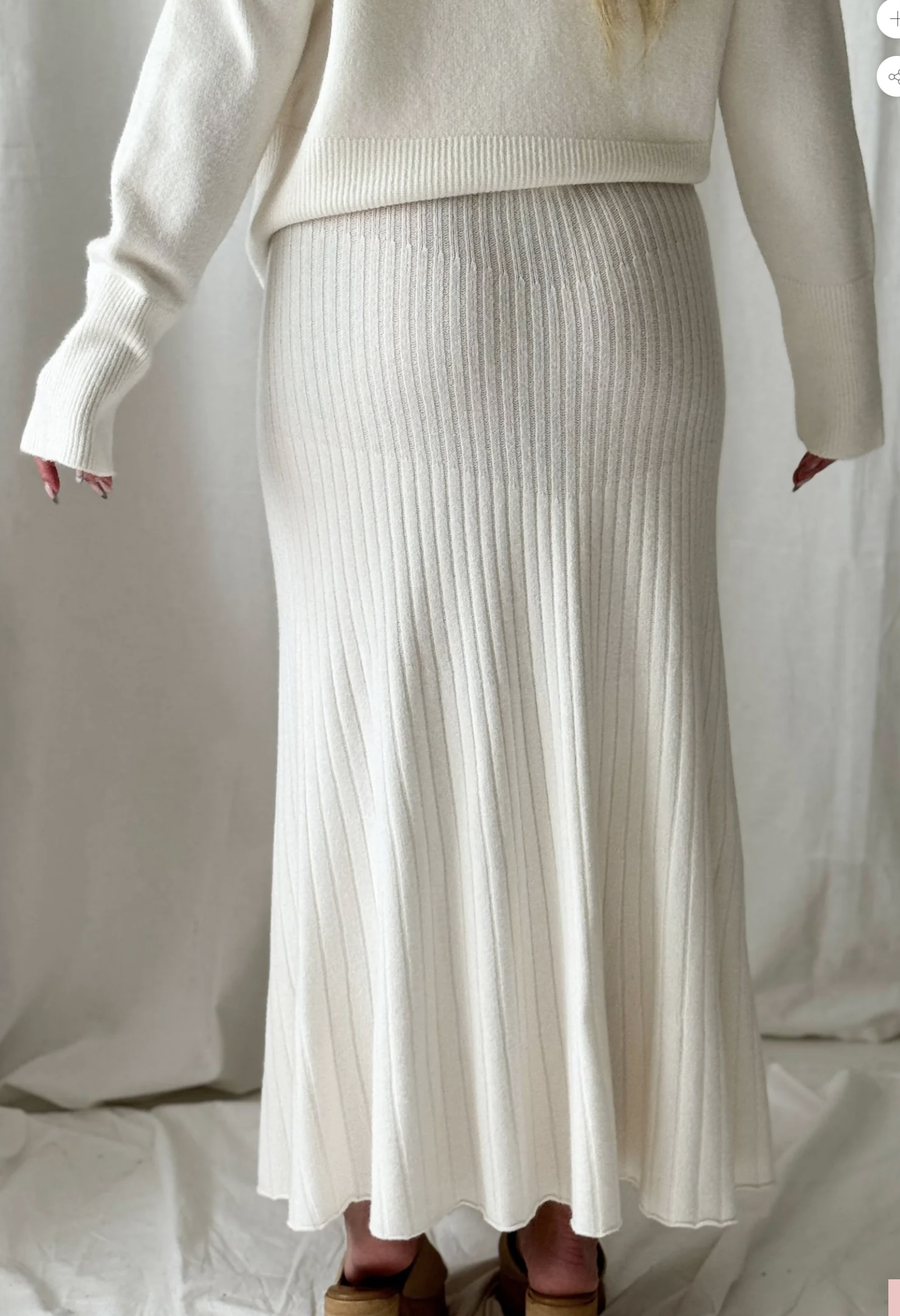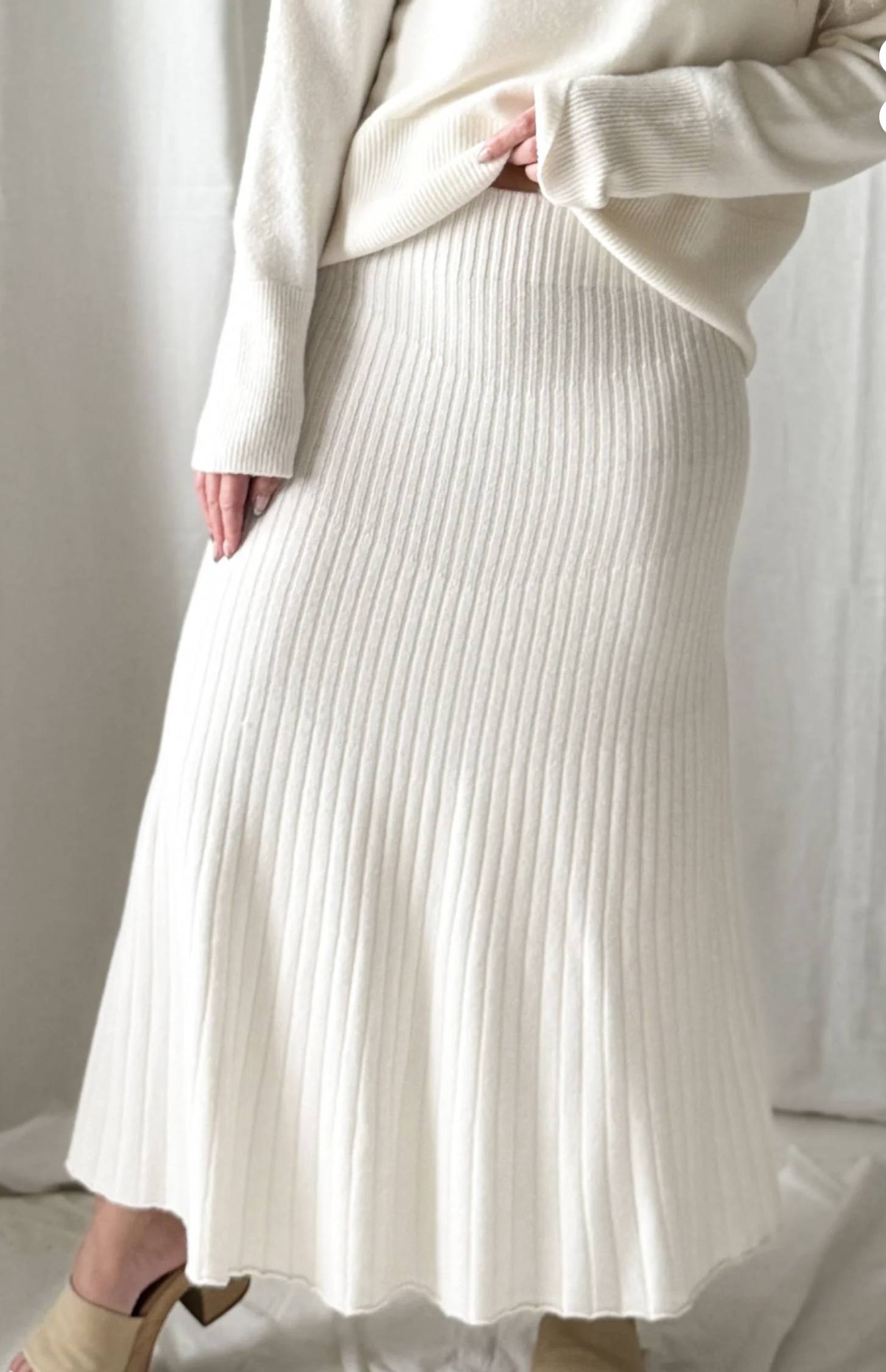 Strickrock in der Farbe Chalk, Grösse: One Size (eher schmal geschnitten) Länge: 85cm, Material: 50% Viscose, 27% Polyester, 23% Polyamid, Maschinenwäsche bei 30° Grad, Made in EU